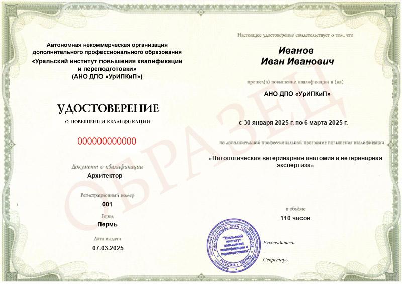 - Удостоверение с присвоением квалификации «Патологическая ветеринарная анатомия и ветеринарная экспертиза» или свидетельство о дополнительном образовании